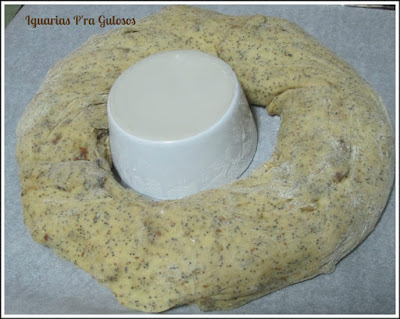 6) Entretanto, untar generosamente com margarina e polvilhar com farinha um tacho alto e com um diâmetro de 20 cm aproximadamente, previamente forrado com papel vegetal.