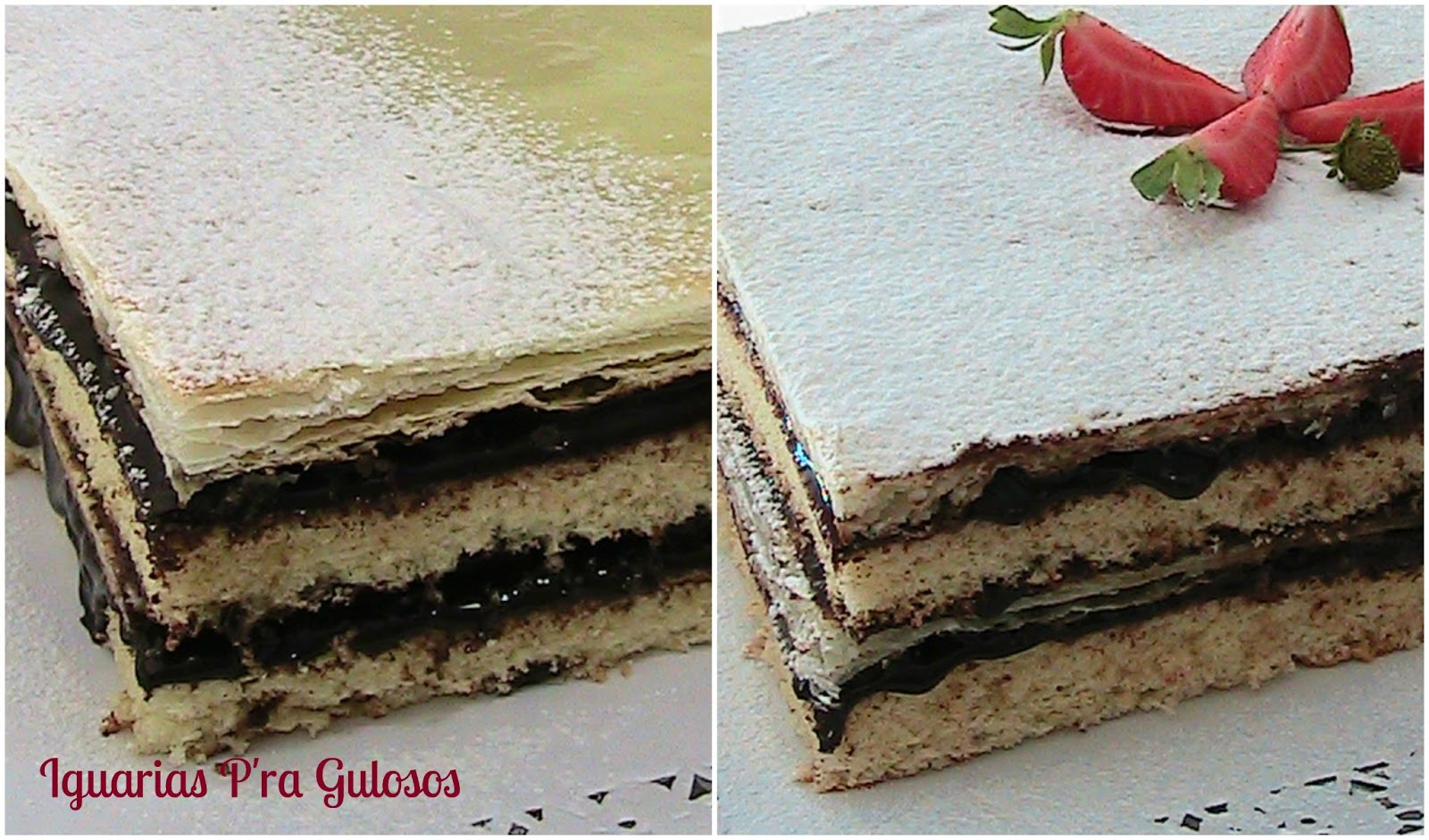 Corte o bolo ao meio, barre uma parte com 1/3 do creme de chocolate, ponha uma placa de massa folhada, barre por cima com um pouco mais de creme. Coloque a outra parte do bolo, barre com o restante creme e por fim cubra com a outra placa de massa folhada.